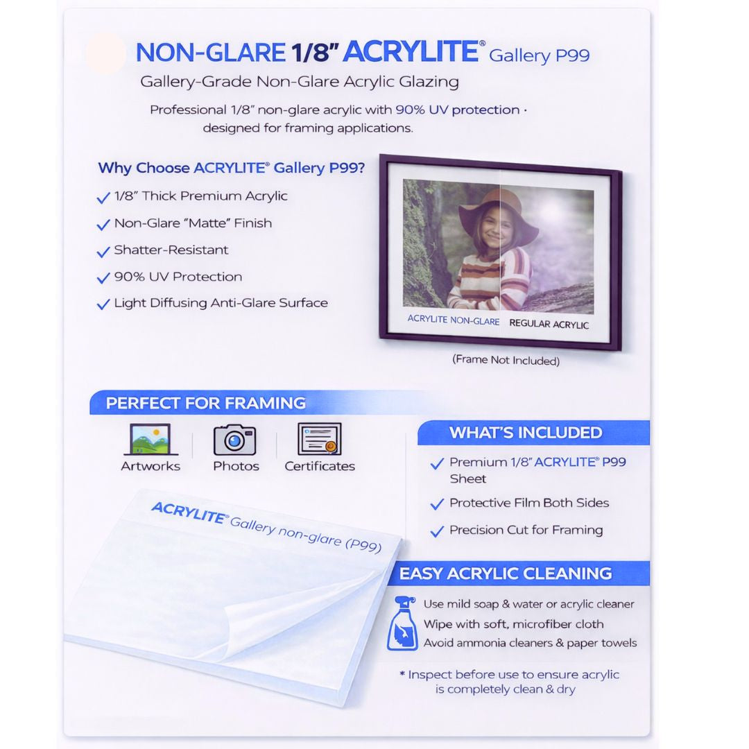 Choose from 99% UV Conservation, 90% UV glare-reducing Non-Glare, 99% UV + Non-Glare, or nearly invisible and museum quality Tru Vue Optium acrylic glass.