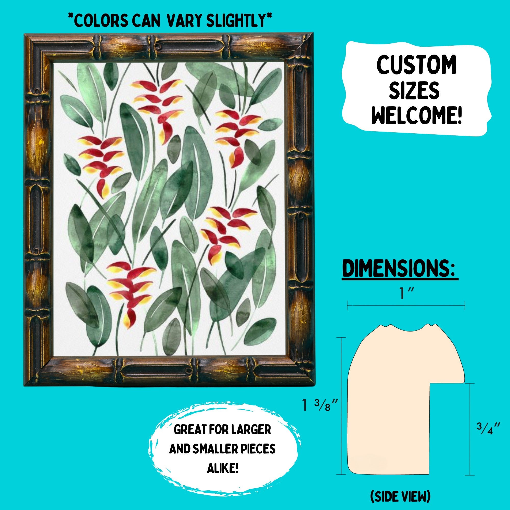 Our Walnut Bamboo Custom Picture Frames are great for posters, canvases, wall art, prints, and more! This tropical & beach style is sure to add a coastal feel to your walls. Ready to hang on the wall with a premium 90% UV acrylic glass cover.
